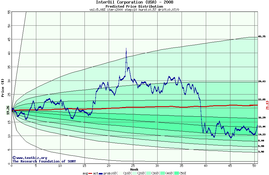 The following graph plots the year-to-date performance of the stock for 2008 compared to the probability calculated by a random walk model.