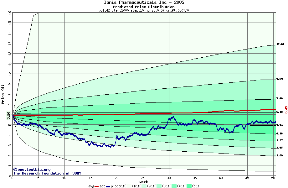 The following graph plots the year-to-date performance of the stock for 2005 compared to the probability calculated by a random walk model.