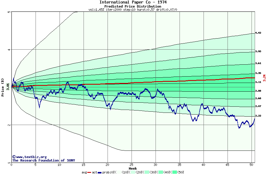 The following graph plots the year-to-date performance of the stock for 1974 compared to the probability calculated by a random walk model.