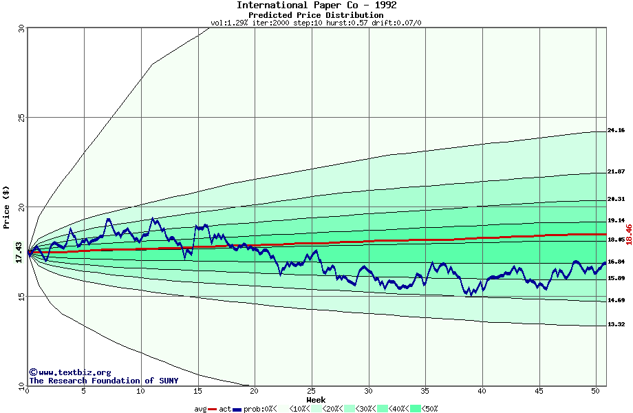 The following graph plots the year-to-date performance of the stock for 1992 compared to the probability calculated by a random walk model.