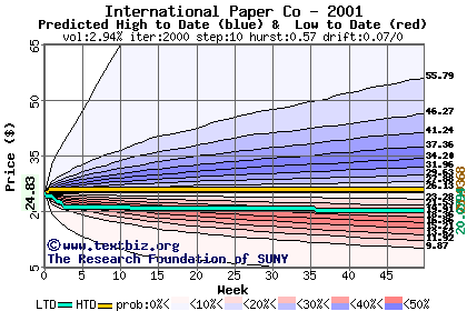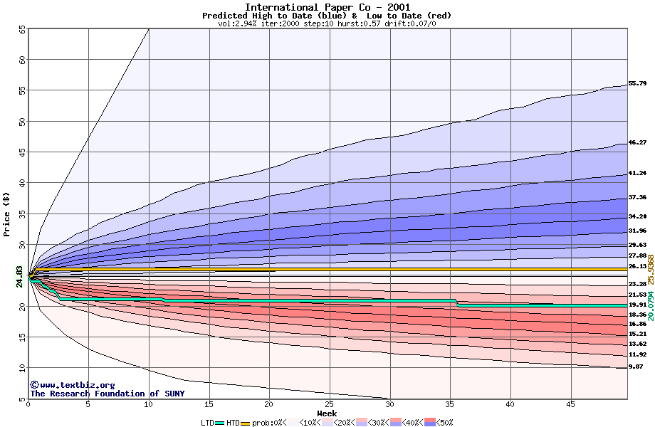 The high to date and low to date prices of the stock plotted against a random walk model for 2001 (what's this?).