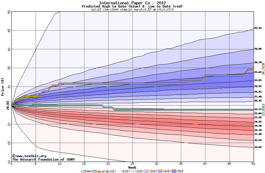 The high to date and low to date prices of the stock plotted against a random walk model for 2012 (what's this?).