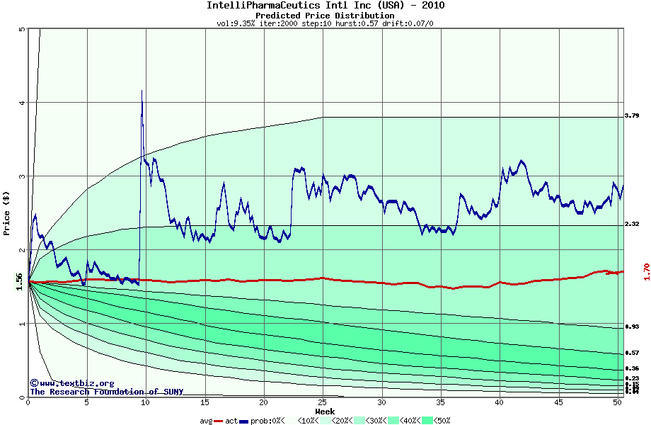 The following graph plots the year-to-date performance of the stock for 2010 compared to the probability calculated by a random walk model.