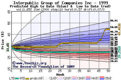 The high to date and low to date prices of the stock plotted against a random walk model for 1999 (what's this?).