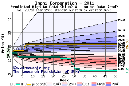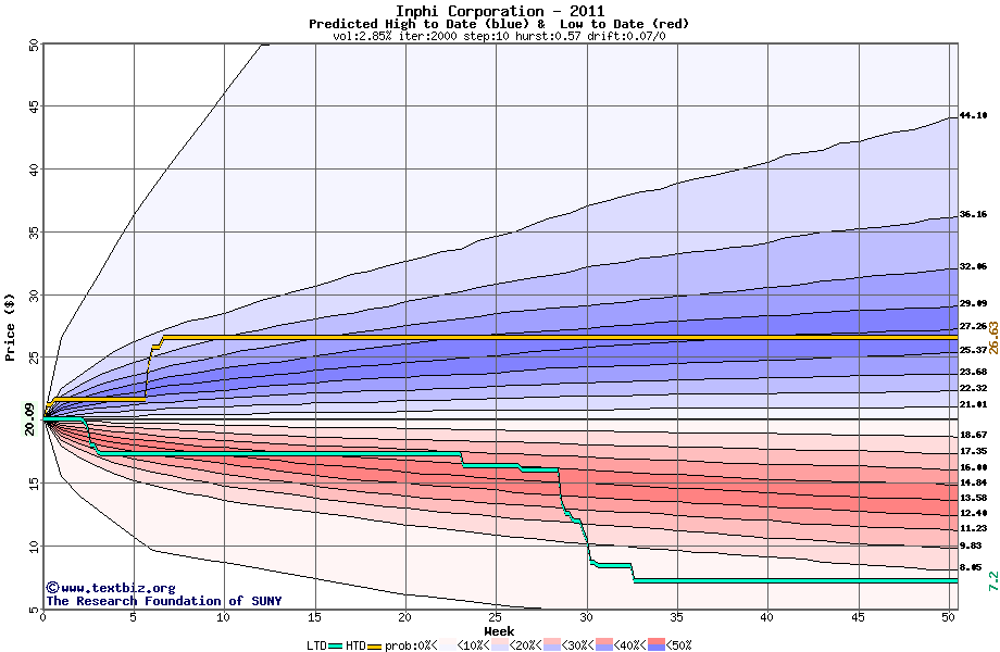 The high to date and low to date prices of the stock plotted against a random walk model for 2011 (what's this?).