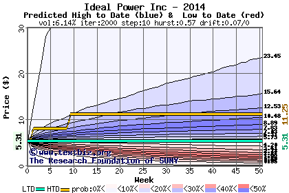 The high to date and low to date prices of the stock plotted against a random walk model for 2014 (what's this?).