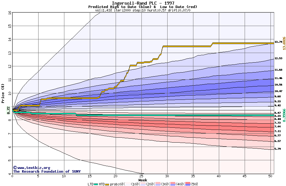 The high to date and low to date prices of the stock plotted against a random walk model for 1997 (what's this?).