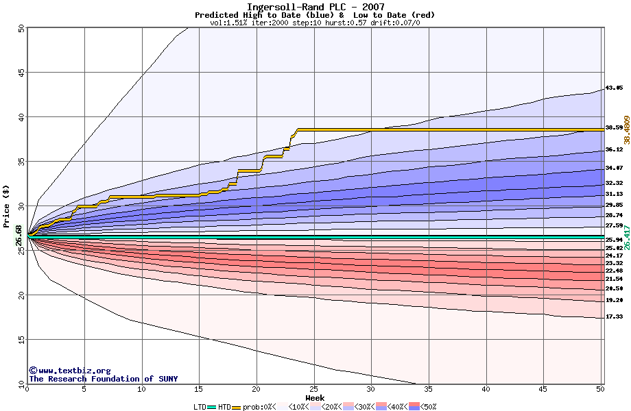 The following graph plots the year-to-date performance of the stock for 2007 compared to the probability calculated by a random walk model.
