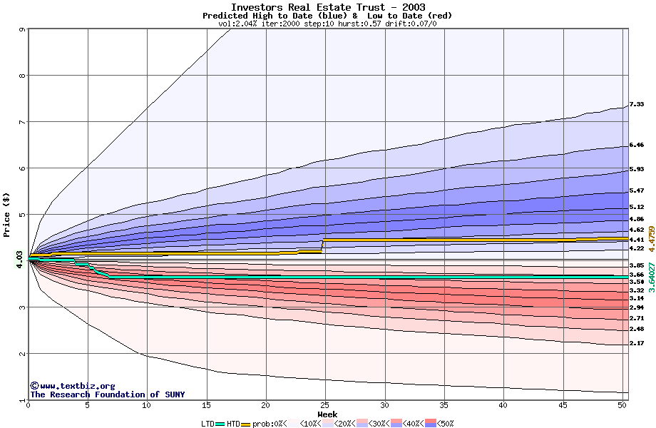 The high to date and low to date prices of the stock plotted against a random walk model for 2003 (what's this?).
