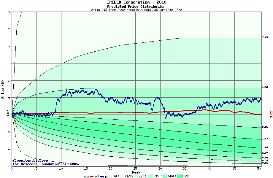 The following graph plots the year-to-date performance of the stock for 2010 compared to the probability calculated by a random walk model.