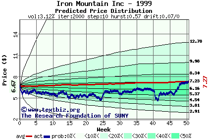 The high to date and low to date prices of the stock plotted against a random walk model for 1999 (what's this?).