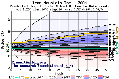 The high to date and low to date prices of the stock plotted against a random walk model for 2004 (what's this?).