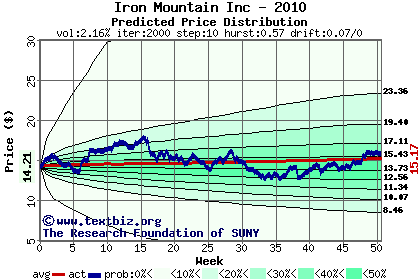 The high to date and low to date prices of the stock plotted against a random walk model for 2010 (what's this?).