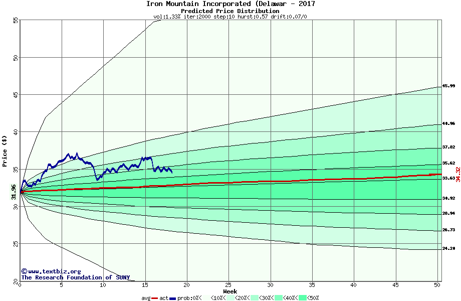 The high to date and low to date prices of the stock plotted against a random walk model for 2017 (what's this?).