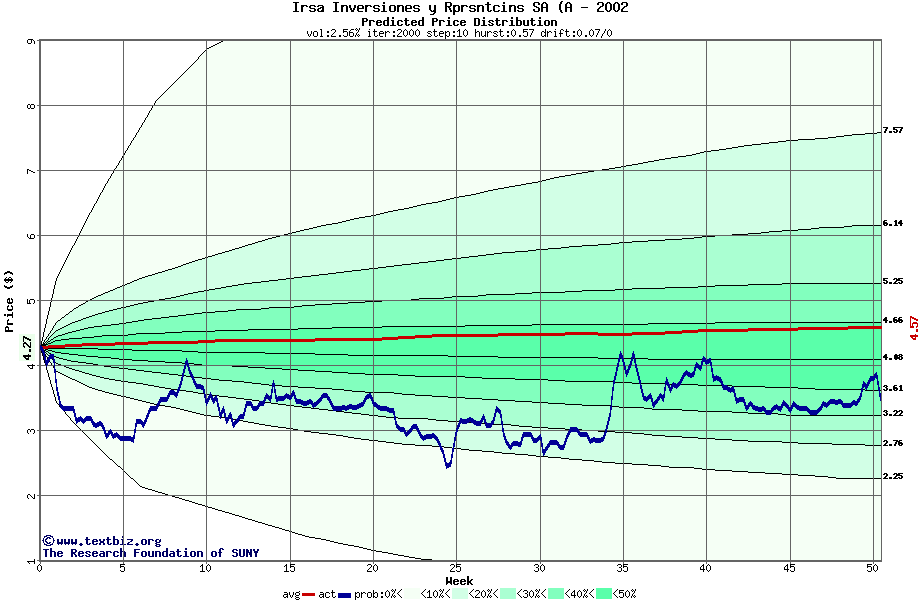 The high to date and low to date prices of the stock plotted against a random walk model for 2002 (what's this?).