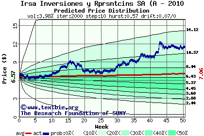The high to date and low to date prices of the stock plotted against a random walk model for 2010 (what's this?).