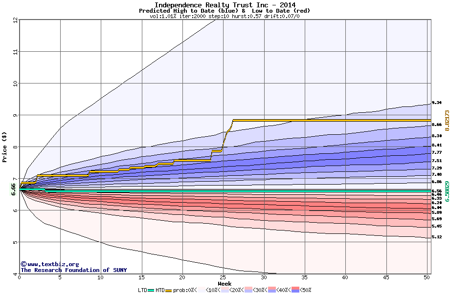 The following graph plots the year-to-date performance of the stock for 2014 compared to the probability calculated by a random walk model.