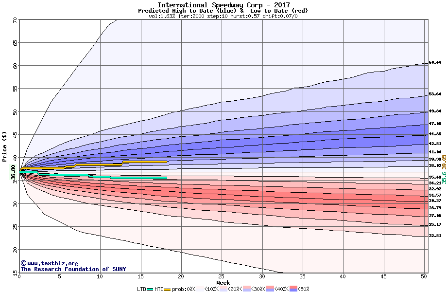The high to date and low to date prices of the stock plotted against a random walk model for 2017 (what's this?).