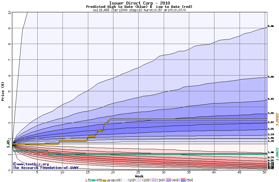 The high to date and low to date prices of the stock plotted against a random walk model for 2010 (what's this?).