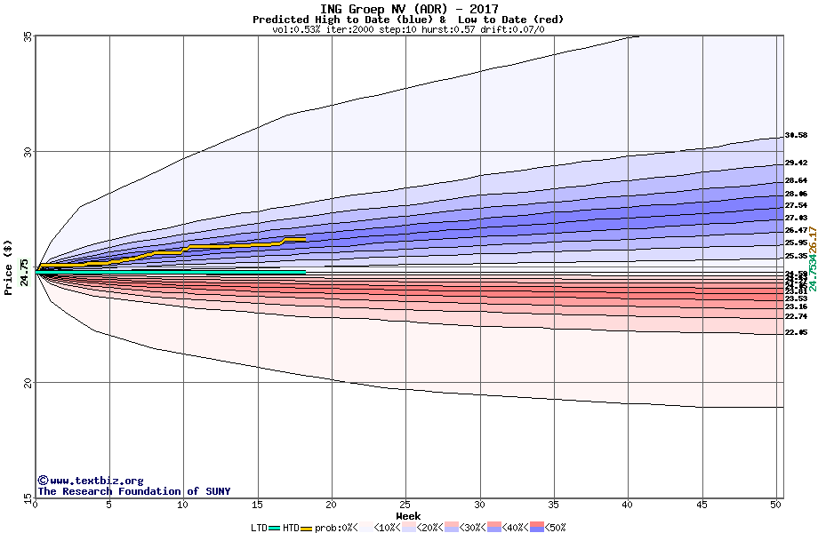 The high to date and low to date prices of the stock plotted against a random walk model for 2017 (what's this?).