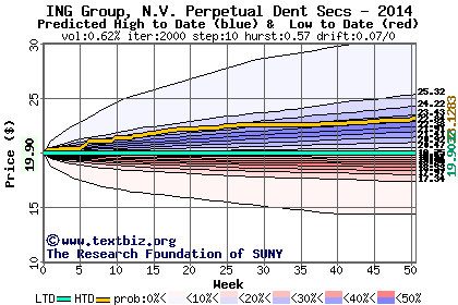 The high to date and low to date prices of the stock plotted against a random walk model for 2014 (what's this?).