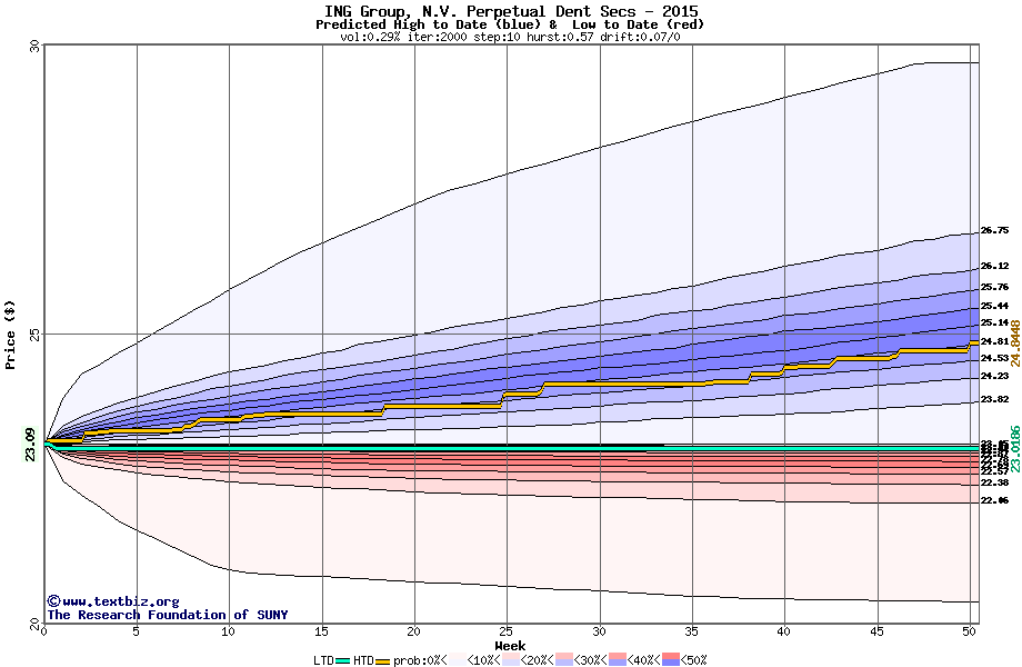 The following graph plots the year-to-date performance of the stock for 2015 compared to the probability calculated by a random walk model.