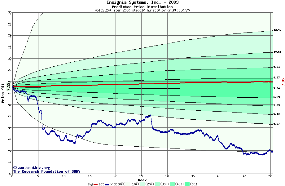 The following graph plots the year-to-date performance of the stock for 2003 compared to the probability calculated by a random walk model.