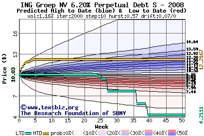 The high to date and low to date prices of the stock plotted against a random walk model for 2008 (what's this?).