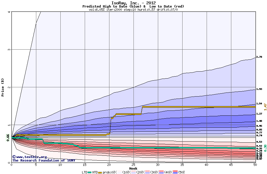 The high to date and low to date prices of the stock plotted against a random walk model for 2012 (what's this?).