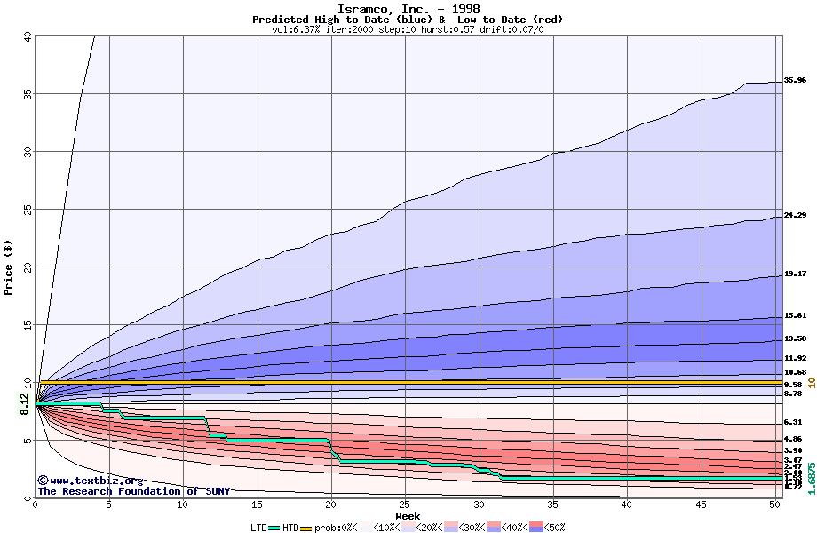 The high to date and low to date prices of the stock plotted against a random walk model for 1998 (what's this?).