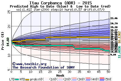 The high to date and low to date prices of the stock plotted against a random walk model for 2015 (what's this?).