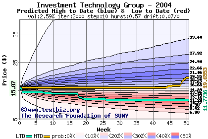 The high to date and low to date prices of the stock plotted against a random walk model for 2004 (what's this?).