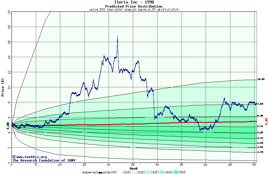 The following graph plots the year-to-date performance of the stock for 1998 compared to the probability calculated by a random walk model.