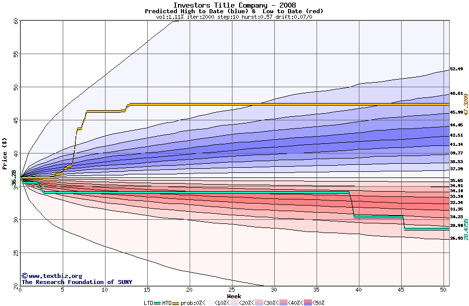 The high to date and low to date prices of the stock plotted against a random walk model for 2008 (what's this?).