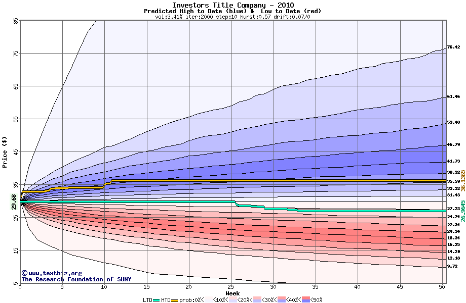 The high to date and low to date prices of the stock plotted against a random walk model for 2010 (what's this?).