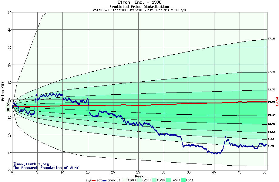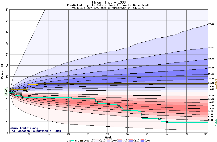 The following graph plots the year-to-date performance of the stock for 1998 compared to the probability calculated by a random walk model.