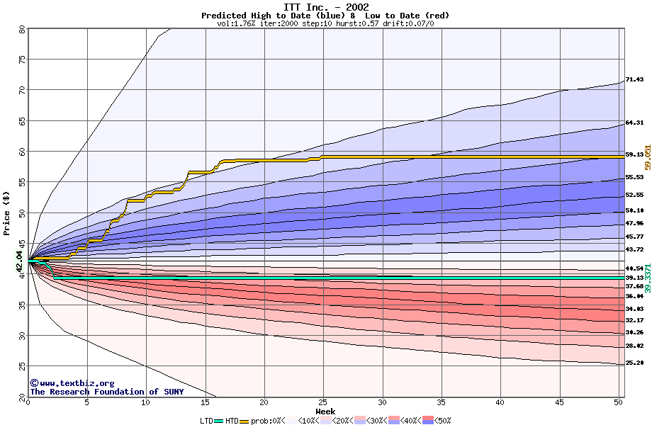 The high to date and low to date prices of the stock plotted against a random walk model for 2002 (what's this?).