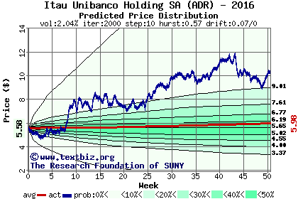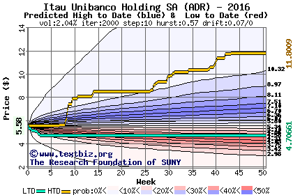 The high to date and low to date prices of the stock plotted against a random walk model for 2016 (what's this?).