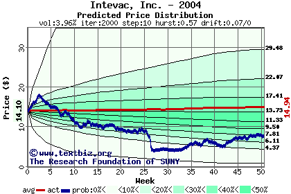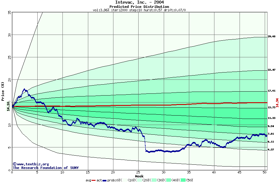 The following graph plots the year-to-date performance of the stock for 2004 compared to the probability calculated by a random walk model.