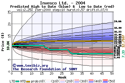 The high to date and low to date prices of the stock plotted against a random walk model for 2004 (what's this?).