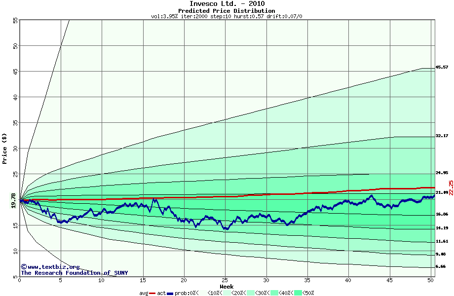 The following graph plots the year-to-date performance of the stock for 2010 compared to the probability calculated by a random walk model.