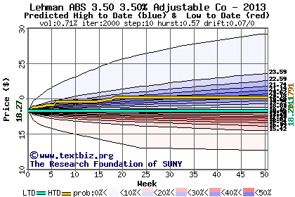 The high to date and low to date prices of the stock plotted against a random walk model for 2013 (what's this?).