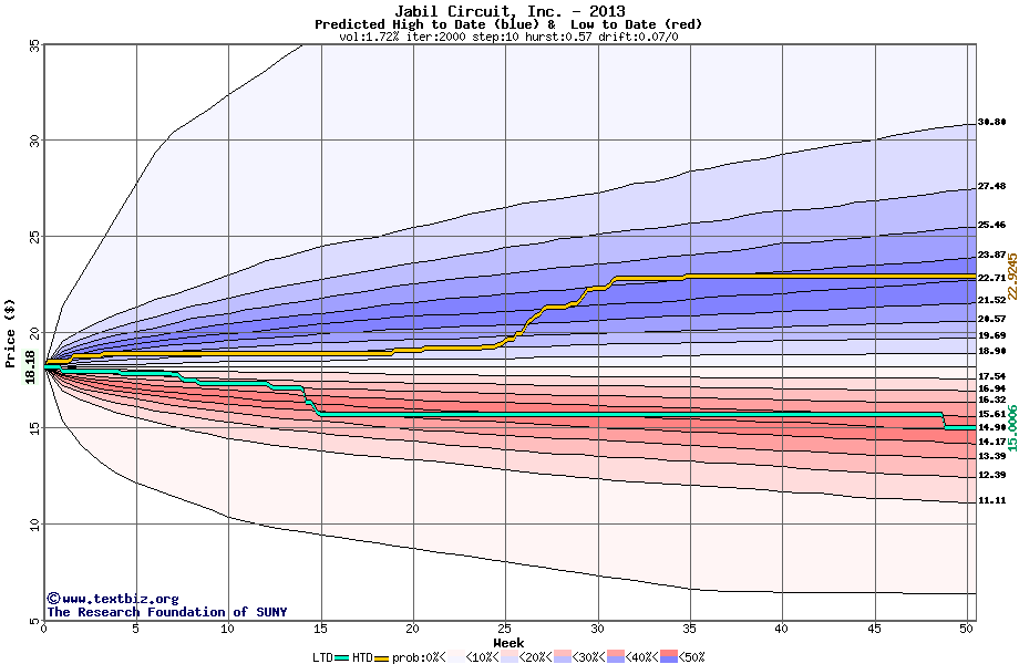 The high to date and low to date prices of the stock plotted against a random walk model for 2013 (what's this?).