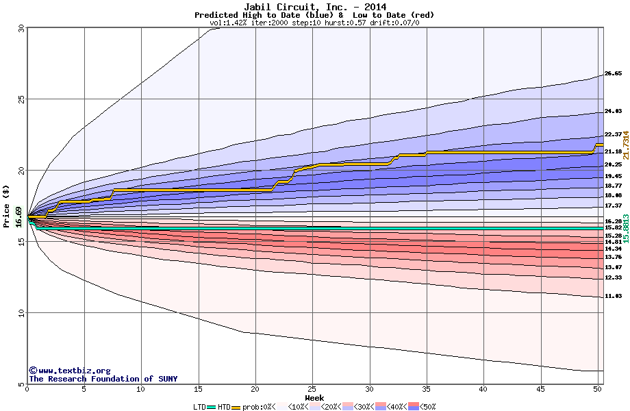 The following graph plots the year-to-date performance of the stock for 2014 compared to the probability calculated by a random walk model.