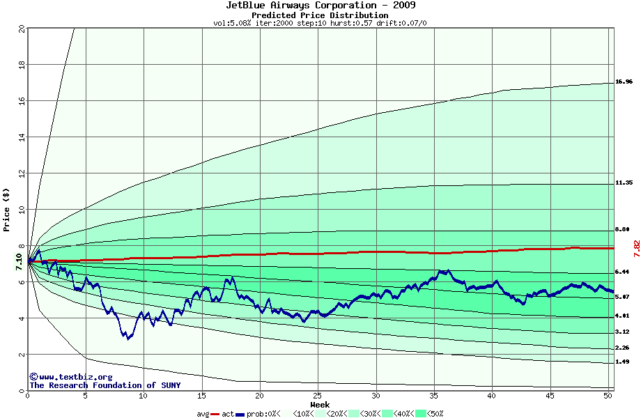 The high to date and low to date prices of the stock plotted against a random walk model for 2009 (what's this?).