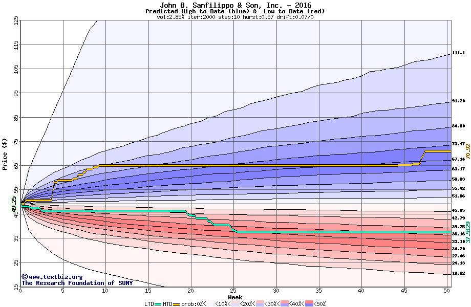 The high to date and low to date prices of the stock plotted against a random walk model for 2016 (what's this?).