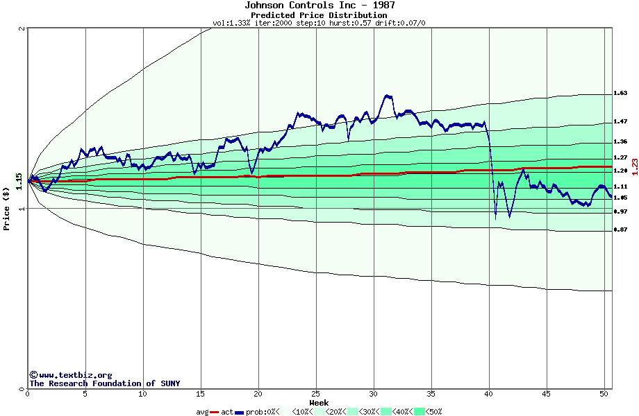 The following graph plots the year-to-date performance of the stock for 1987 compared to the probability calculated by a random walk model.