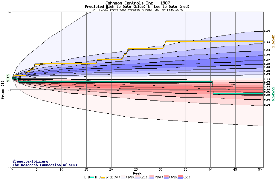 The high to date and low to date prices of the stock plotted against a random walk model for 1987 (what's this?).