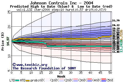 The high to date and low to date prices of the stock plotted against a random walk model for 2004 (what's this?).