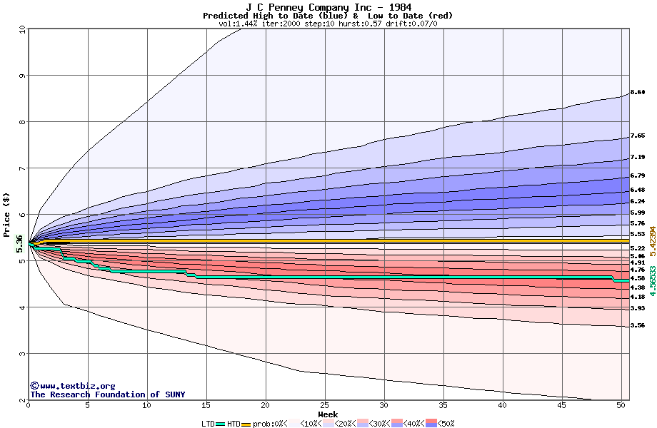 The following graph plots the year-to-date performance of the stock for 1984 compared to the probability calculated by a random walk model.